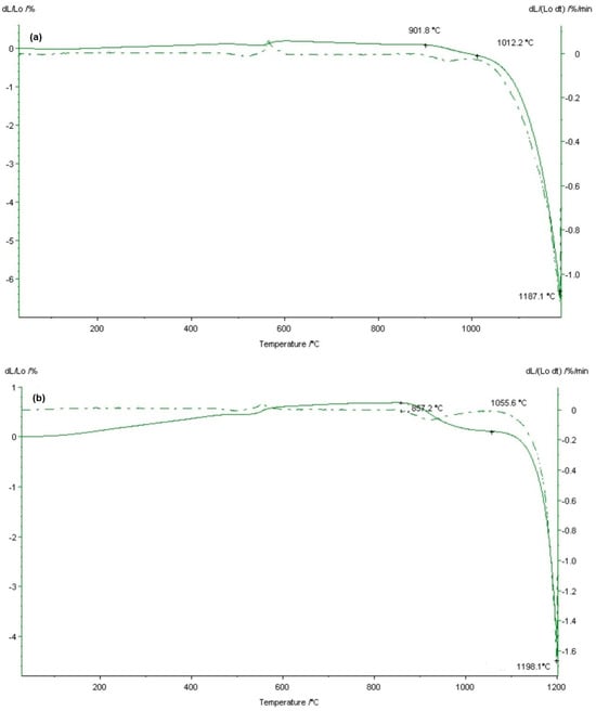 Dilatometric behavior of the red ceramic tile formulations: (a) TC1; (b) TC4.