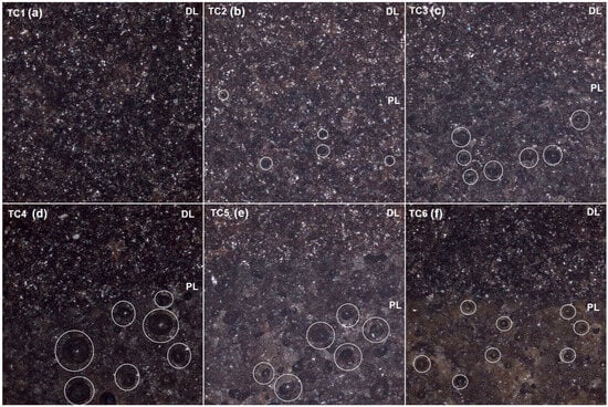 Confocal images (×180) of fired bi-layered red ceramic tiles (DL—dense layer; PL—porous layer): (a) TC1; (b) TC2; (c) TC3; (d) TC4; (e) TC5; (f) TC6. Pores are highlighted with white circles.