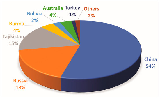 According to Laznicka [19,20] the global collection of 24 giant antimony deposits included a cumulative quantity of 6.97 million metric tons of antimony. According to Laznicka’s estimation, the overall world endowment of antimony is projected to range from 7.1 to 7.5 million metric tons [3]. The most significant reserves are located in China, Russia, Bolivia, Mexico, USA, South Africa, and Tajikistan. Approximately one-third of these deposits are found in China [3,21].