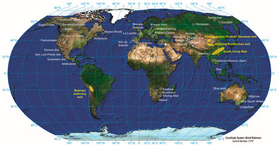 Antimony fissure-vein deposits can manifest in areas enclosed by extensive shear zones and strike-slip fault zones [3]. According to the study conducted by Pitcairn et al. [30], it was suggested that high-grade metamorphism, distinguished by temperatures over 400 °C, can facilitate the mobilization of antimony and its subsequent transportation by hydrothermal fluids. Under certain conditions, these fluids may subsequently lead to the development of quartz–antimony veins at lower temperatures. Most prominent quartz–stibnite deposits exhibit distinct features, such as siliciclastic sedimentary host rocks and focused migration pathways for upward hydrothermal fluid circulation from deeper high-temperature crustal levels. The primary sources of present and recent mine production are the quartz–stibnite veins and replacement deposits. Various types of hydrothermal systems have the potential to give rise to these formations, such as the peripheral regions of orogenic gold deposits, intrusion-related gold deposits, porphyry copper and molybdenum deposits, polymetallic mesothermal vein deposits, and sediment-hosted Carlin-type gold deposits [31]. Additionally, they may be isolated without any discernible connection to other mineral deposits. Notable quartz–stibnite deposits of the utmost importance include the Kharma deposit (Bolivia), the Beaver Brook and Lake George deposits (Canada), the Xikuangshan deposit (China), the Sarylakh and Sentachan deposits (Russia), the Consolidated Murchison deposit (South Africa), and the Yellow Pine and U.S. Antimony Mine deposits in Montana (MT, USA) (Figure 3) [3].