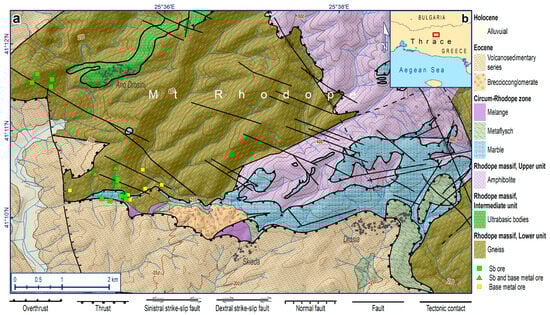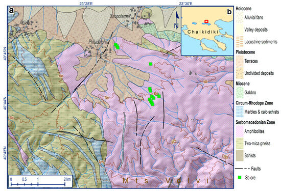(a) Geological map of the broader Philadelphia area (modified after [97,98]). The Sb ore mineralization sites are shown with green boxes (based on [37]). (b) Inset map showing the location of map (a).