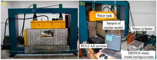 A simulation test platform was established to replicate the undersea deposit mining conditions of the Sanshandao gold mine. The setup, illustrated in Figure 2, includes a horizontal side pressure-loading apparatus, a vertical pressure-loading mechanism, a testing framework, a hydraulic servo pump station, a control console, and measuring instruments. Its notable technical specifications comprise a maximum vertical load capacity of 300 kN, hydraulic loading capabilities up to 1.0 MPa, horizontal displacement within the range of 0–100 mm, and model dimensions measuring 1600 mm × 800 mm × 200 mm.