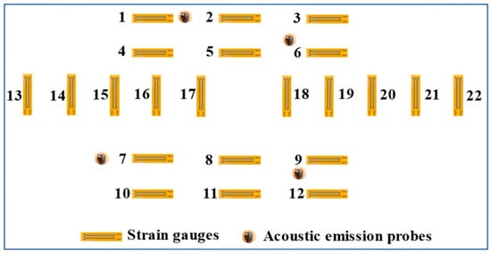 In the simulation experiment, solid paraffin and liquid paraffin were utilized as cementing agents, with river sand and barite powder serving as aggregates. To evaluate the deformation characteristics of the analogous test platforms, the experiment employed the PCI-2 Acoustic Emission (AE) system for real-time monitoring of AE events. Additionally, a strain gauge was attached and connected to the DH3816 static strain test system, as depicted in Figure 3, where the numbers refer to the code numbers of the strain gauges.