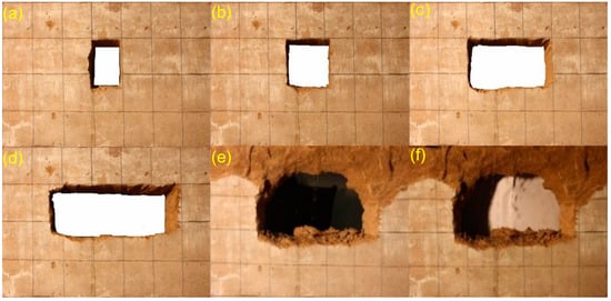 The experimental setup maintained a 1:200 similarity ratio, conducting the excavation in ten sequential steps, progressing from the center outward, with each step involving an excavation depth of approximately 0.04 m. Figure 4 illustrates the stepwise process in a simulated mining environment with 10 m of seawater and 35 m of sea mud. A 40 m safety roof thickness was upheld. Photos in Figure 4a–f capture the chamber’s span at 0.14 m, 0.28 m, and 0.4 m. Our analysis, applying the similarity ratio and safety thickness–span ratio formula, revealed that a roof thickness exceeding 40 m eliminated the risk of water inrush in the rock formation. Conversely, when the thickness fell below 40 m, characteristics indicative of a water inrush emerged, as shown in Figure 4f.