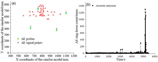 Acoustic emission distribution and monitoring signals: (a) acoustic emission signal time–space distribution, (b) monitoring signals.