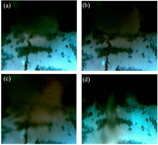 Following a substantial increase in AE signals, a thorough inspection was promptly conducted using a stereo microscope, and microscopic measurement analysis software was applied to scrutinize the fissures. As illustrated in Figure 6, the measurement graph depicts an average fissure width of 0.02 mm and a horizontal inclination angle of 20.58° for the upper fracture. Figure 6 provides a comparative illustration, presenting the conditions both before and after the emergence of fracture-induced water flow within the test module. The tests have unequivocally demonstrated that once the distance between the stope roof and the fissures drops below 40 m, pressurized water initiates continuous erosion of the fissures, eventually forming a smoothly channelized conduit. This streamlined outflow of water from the fissures signifies a fundamental aspect of the model’s water inrush failure mechanism.