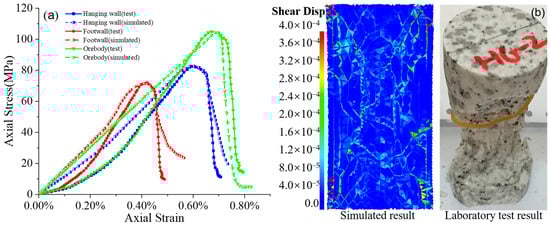 Uniaxial compression test simulation for the Sanshandao gold mine: (a) stress-strain relation of the experiment and simulation test; (b) failure model with damage extent.