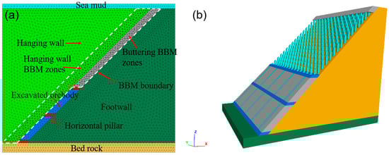 The excavation simulation of the isolation layer was conducted utilizing the 3DEC Bonded Block Model. In the Xinli mining area, ore bodies located below the −165 m level undergo high-drift filling mining, employing a stage height of 50 m and roof and floor pillars each having a thickness of 6 m. For ore bodies situated above the −165 m level, the point-pillar-layered filling mining method is applied. Within this mining region, the average horizontal thickness of the ore bodies varies from 20 to 40 m, featuring an average grade of approximately 3 g/t and an inclination angle typically ranging between 33° and 67°. For our analysis, we maintain a consistent orebody inclination angle of 62°, as depicted in Figure 8.