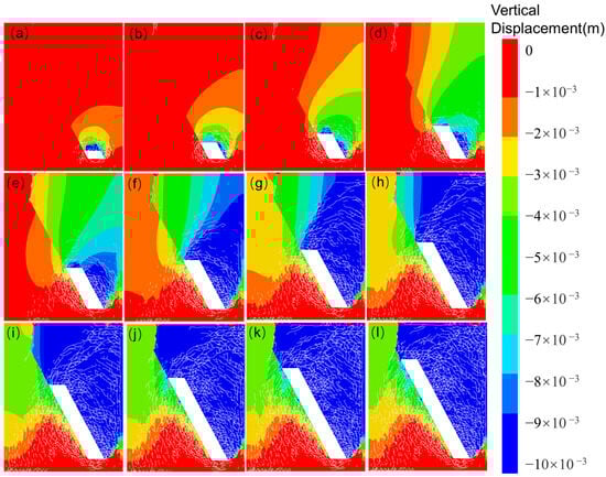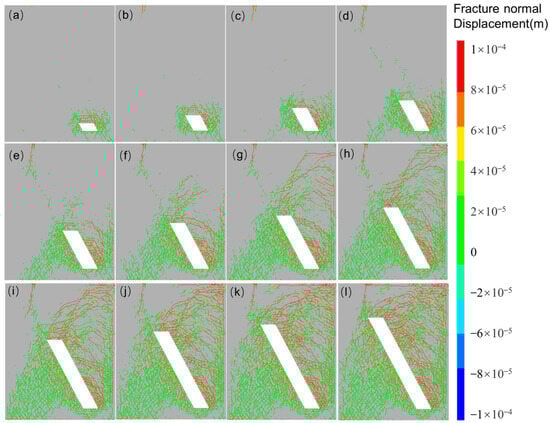 Vertical displacements (contours) and fracture extensions (white lines) after excavation at different levels, with (a–l) corresponding to the excavation levels of −165 m to −55 m.