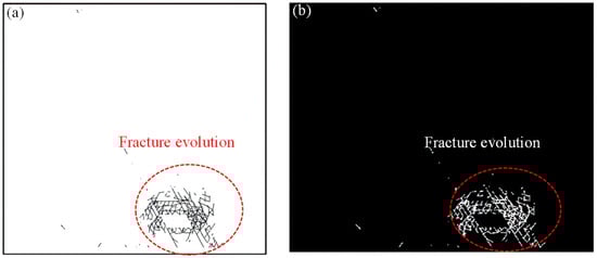 Image binarization processing of fracture extension evolution (level −155 m): (a) fracture propagation, (b) fracture binarization treatment.