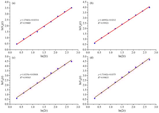 Clearly, as the thickness of the isolation layer decreases, there is a corresponding increase in the number of fractures. Fractal dimensions prove to be highly effective in quantitatively characterizing the propagation of these fractures. Our examination focused on the fractal dimension of a two-dimensional plane for clarity, but three-dimensional models imply the potential for extending calculations to three-dimensional space if required. To achieve this quantification, we calculate the fractal dimension of these fractures. In practical applications, this computation involves determining the values of ln(2n) and lnNn(A) through a systematic enumeration of box sizes, with n incrementing sequentially from 1 to N. These values are then used to construct a curve, with ln(2n) plotted on the abscissa and lnNn(A) on the ordinate. In this paper, two-dimensional diagrams illustrating fracture propagation are employed to delineate their fractal attributes, as depicted in Figure 11.