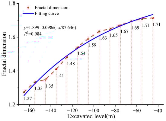 Figure 13 presents the curve illustrating variations in fracture fractal dimensions. The curve reveals a noticeable pattern, indicating a transition from substantial increases to a more gradual growth in the number of fractures. Notably, the slope of the fractal dimension curve in the initial half of the graph exceeds that in the latter half. In simpler terms, the fracture fractal dimension underwent rapid escalation until the isolation layer was mined down to the −115 m level. Subsequently, the rate of growth in the fracture fractal dimension gradually diminished.