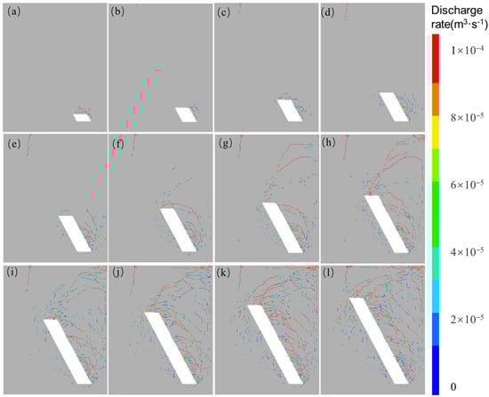 Based on the simulation results of the flow patterns, the water flow discharge rate across the entire area is illustrated in Figure 14. In the initial stages of isolation layer excavation, the water flow predominantly concentrated around the hanging wall rock mass and the goaf’s roof. It is noteworthy that the water flow exceeded 100 mL/s upon the penetration and expansion of the master fracture within the isolation layer.
