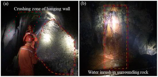 On-site investigation of crushing zone (a) and water inrush in hanging wall (b).