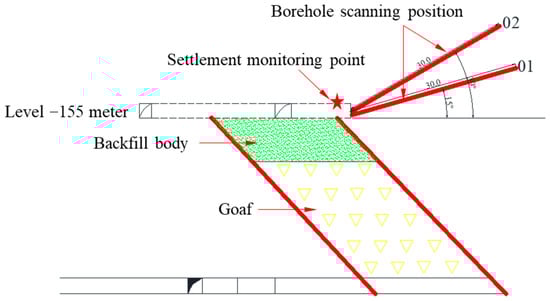 To validate the reliability of the simulation results, we utilized the isolation layer situated at −165 m as the mining test stope. Concurrently, we performed core drilling on the hanging wall at −155 m, as depicted in Figure 16. In light of this, we introduced an observation hole method to assess the extent of fracture propagation.