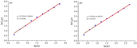 After obtaining the fracture distributions, we applied the box dimension calculation principle to process the original borehole images from Figure 18. These borehole images were considered to have a size of 2.0 m × 2.0 m, covering grids with precision successively set at 0.2 m, 0.1 m, 0.05 m, and 0.025 m. Through regression analysis using Equation (9), the regression equations for the rock fracture fractal dimensions of boreholes No.01 and No.02 were determined as follows: y = 1.27109x + 0.04064 and y = 1.23512x + 0.03274, respectively. The corresponding regression coefficients were R2 = 0.99188 and R2 = 0.99755, as shown in Figure 19.