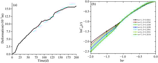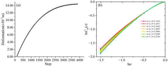 Simulated settlement and its correlation dimension, (a) the simulated deformation of rock mass, (b) correlation dimension of simulated deformation of rock mass.