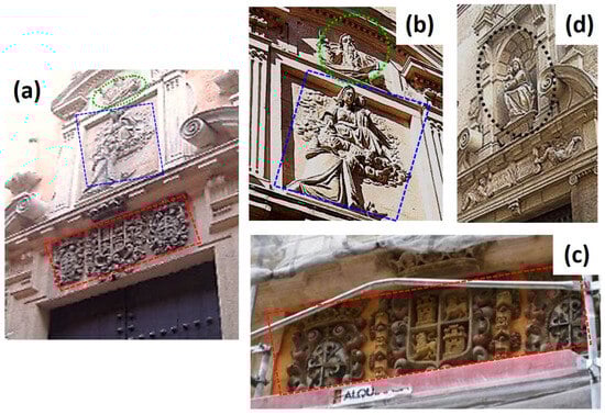 This is why the façade of the Madre de Dios Convent (Figure 1a–c) was selected for this study. The polychrome of the reliefs and lintel has been preserved, including the red incarnation of the lips of the Virgin and some of the face, and an important part in the coats of arms of Castile and the Dominicans of the lintel. This polychrome was restored in the restoration works of the façade in 2021, recovering its past splendour [].