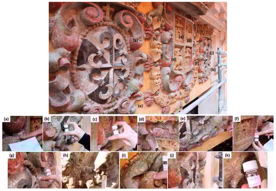 Photos of sampling zones within the façade of the Madre de Dios Convent (in white square): (a) sample 1, blue colour; (b) sample 4, green colour; (c) sample 5, green colour; (d) sample 10, green colour; (e) sample 9, turquoise colour; (f) sample 2, red colour; (g) sample 3, red colour; (h) sample 11, red-brown colour; (i) sample 6, yellow colour; (j) sample 8, black colour; and (k) sample 7, golden colour.