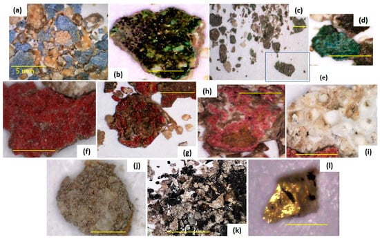 Micrographs corresponding to the different samples studied in this work: (a) blue sample 1; (b) green sample 10; (c) green sample 4; (d) green sample 5; (e) turquoise sample 9; (f) red sample 3; (g) red sample 2; (h) red sample 11; (i) support of the red sample 3; (j) yellow sample 6; (k) black sample 8; and (l) golden sample 7.