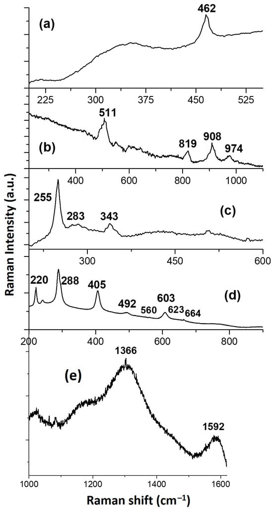 The elemental analysis of sample 11, performed using the EDX analyser, indicated the presence of silicon (Si), lead (Pb), iron (Fe), manganese (Mn), calcium (Ca), and aluminium (Al) (Table 1 and Figure S5c). Other punctual chemical analyses clearly showed the presence of iron (Fe) and manganese (Mn) (Table 1 and Figure S5d), which were responsible for the colour. The Micro-Raman spectroscopy of the sample showed peaks at 220, 288, 405, 492, and 603 cm−1, which were attributed to red earth (hematite or Mars red and clay minerals) [], as well as some manganese oxides with signals at 560 and 623 cm−1 (manganite, MnO(OH)) and 664 cm−1 (pyrolusite, MnO2) [] (Figure 4d). The pigments responsible for the brownish colouration of sample 11 were red earth pigments (Fe2O3 + silicoaluminates) together with possibly sienna earth pigments (Fe2O3 + Mn oxides + silicoaluminates).