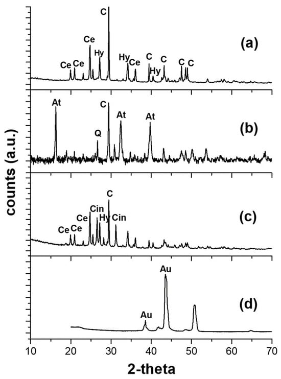 XRD diffractograms of the following samples: (a) blue 1; (b) green 10; (c) red 3; and (d) golden 7 [C = calcite, Hy = hydrocerussite, Ce = cerussite, At = atacamite, Q = quartz, Cin = cinnabar, and Au = gold].