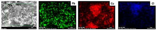 The general chemical analyses performed on this sample using EDX showed the presence of high percentages of calcium (Ca) and lead (Pb). Other elements such as silicon (Si), copper (Cu), chlorine (Cl), iron (Fe), aluminium (Al), and sodium (Na) were also present (Table 1 and Figure S3a). The punctual chemical analyses on some of the green particles performed using the EDX analyser (Table 1 and Figure S3b) indicated the major presence of copper (Cu) and chlorine (Cl), suggesting the presence of atacamite. EDX mapping of the green particles showed a composition based on copper (Cu), chlorine (Cl) (both elements matched in the central area), and lead (Pb) (Figure 6), which were respectively attributed to the composition of the green colour and the support on which the pigment was laid. The chemical analyses of the stone indicated a predominance of calcium (Ca), which is consistent with a calcarenite composition (Table 1 and Figure S3c), and also lead (Pb), aluminium (Al), and silicon (Si), possibly from the layer on the rock support. The X-ray diffraction analyses of the green colour (Figure 5b) indicated the presence of atacamite (Cu2Cl(OH)3, PDF 25-0269; signals at 2Θ = 16.2°, 32.4°, and 39.5°), calcite (CaCO3, PDF 05-0586; signals at 2Θ = 29.4°, 39.4°, 43.1°, 47.4°, and 48.5°), and quartz (SiO2, PDF 33-1161; signals at 2Θ = 27.4° and 21.0°). The analysis using Raman spectroscopy confirmed the presence of atacamite due to their bands at 511, 819, 908, and 974 cm−1 [] (Figure 4b).
