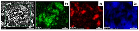Figure 3i shows the red-coloured layer on the Pb-based preparatory layer and the rock material, which was clearly distinguished by its whitish colour. The XRD diffractogram of sample 3 (Figure 5c) showed the presence of cinnabar (HgS, PDF 42-1408; peaks at 2Θ = 26.5°, 28.2°, and 31.2°), cerussite, hydrocerussite, and calcite. The EDX punctual chemical analyses of sample 3 showed the presence of mercury (Hg) and sulphur (S) (Table 1 and Figure S5a), which are characteristic of cinnabar or vermilion pigment. Both are names assigned to a single chemical composition (HgS) of different origins, with the first being natural and the second being synthetic. In addition, the general EDX analyses of this sample (Table 1 and Figure S5b) showed the presence of silicon (Si), aluminium (Al), sodium (Na), potassium (K), and iron (Fe), which were attributed to minerals that accompanied the cinnabar mineral. A high percentage of lead (Pb) also appeared, which was attributed to the underlayer, and calcium (Ca) appeared from the original rock support. The mapping analysis of these samples carried out using EDX showed the presence of particles constituted by mercury (Hg), lead (Pb), and calcium (Ca) (Figure 7). The semiquantitative estimation of the composition showed the following values (in % w/w): PbO = 37,88; HgO = 23,45; SO3 = 22,91; CaO = 10,36; K2O = 9.38; SiO2 = 3.90; and Fe2O3 = 0.36, according to the data described previously. The Raman spectroscopy analysis confirmed the presence of cinnabar, thanks to the signals at 255, 283, and 343 cm−1 [,] (Figure 4c). Very similar results were observed for sample 2.