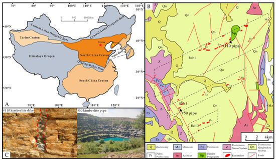 Kimberlites, a rare type of ultramafic volcanic rock, are one of the main host rocks for diamonds [1,2]. Kimberlite magma can carry a large number of mantle xenoliths from the deep Earth and is an important medium for understanding deep geological processes [3,4]. Although abundant research relevant to the petrogenesis and metallogenic processes of kimberlites [5,6,7,8,9,10] has been conducted, the emplacement mechanisms of kimberlites and the role of melts/fluids during later magmatic evolution are still unclear. In addition, the relationship between the emplacement pattern of kimberlite magma and its diamondiferous capacity has received much attention from geologists, and the relationship between the emplacement pattern and magma composition intrigues us, especially the question of whether these factors are affected by the geological environment.