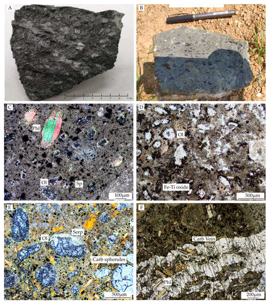 Representative images showing the different petrographic features of (B,D,F), the #110 dike kimberlites, and (A,C,E) the #50 root-zone kimberlites. (A,B) show the rock samples from the #50 root-zone kimberlite and #110 dike kimberlite, respectively. (D,F) present plane-polarized transmitted light photomicrographs. C and E present cross-polarized transmitted light photomicrographs. Carb: carbonate, Serp: serpentine, Ol: olivine, Phl: phlogopite, and Sp: spinel. The Fe-Ti oxides are spinel and magnetite.