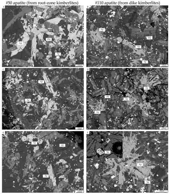 Backscattered electron images of the types of apatite (Ap) in the kimberlites. Ol: olivine, Phl: phlogopite, and Sp: spinel (A–F).
