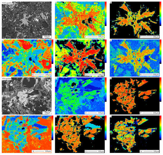 Backscattered electron (BSE) images and X-ray element maps of #110 apatite crystals from the #110 dike kimberlites and the #50 apatite from the #50 root-zone kimberlites. The color scale to the right of each panel indicates the relative concentration of each element, i.e., cool colors (blue, black) denote low concentrations, and warm colors (red, orange) denote high concentrations. The warmness or coolness of the colors is only relative, reflecting the difference in concentration between apatite and its surrounding matrix (A–J).