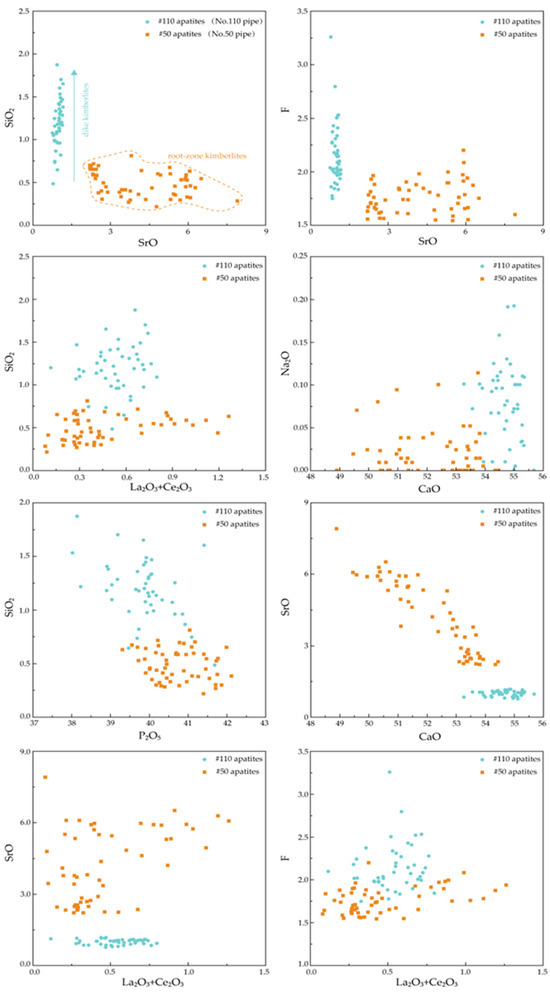Oxide–oxide variation diagrams for apatite grains from the #110 dike kimberlites and #50 root-zone kimberlites analyzed in this study. The circles denote samples of the #110 apatite (dike kimberlites), and the square symbols denote samples of the #50 apatite (root-zone kimberlites).