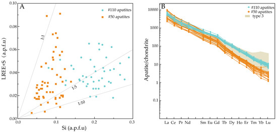 (A) Plot of S + LREE (La + Ce) vs. Si (atoms per formula unit, a.p.f.u) showing the compositions of the apatite from the dike kimberlites (pipe No. 110) and root-zone kimberlites (pipe No. 50) analyzed in this study. (B) Chondrite normalized REE patterns of the apatite from the dike kimberlites (pipe No. 110) and root-zone kimberlites (pipe No. 50). The Type 3 apatites are prismatic euhedral apatites from the phlogopite-rich Ekati Mine kimberlites.