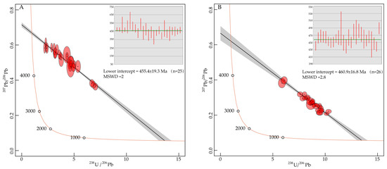 The 238U/206Pb ratio of the #50 apatite varies from 2.183 to 7.037 (average = 4.133), and the 207Pb/206Pb ratio varies from 0.363 to 0.615 (average = 0.507). An isochron was obtained by fitting it on the Tera–Wasserburg diagram. The lower intercept is 455.4 ± 19.3 Ma (MSWD = 2). The 238U/206Pb ratio of the #110 apatite varies from 5.865 to 10.320 (average = 8.705), and the 207Pb/206Pb ratio varies from 0.207 to 0.398 (average = 0.271). An isochron was obtained by fitting a straight line through these apatite data. From the lower intercept with the Concordia curve, we obtain an age of 460.9 ± 16.8 Ma (MSWD = 2.8) (Figure 7).