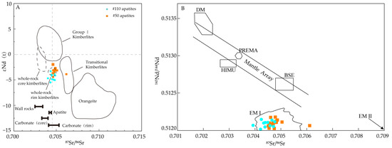(A) Initial 87Sr/86Sr vs. εNd variations of the Wafangdian apatite. The dashed-line fields denote Kuruman whole-rock kimberlite data from Donnelly et al. (2011) [60,61]. The kimberlite, orangeite, and transitional kimberlite fields are from Yang et al. (2009) [33] and the references therein. The initial Sr isotope compositions of the groundmass apatite and carbonate from the Kuruman kimberlites are indicated by thick lines parallel to the X-axis; no corresponding Nd data are available for these samples. (B) DM-depleted mantle, BSE-bulk silicate earth, EMI- and EMII-enriched mantle, HIMU-mantle with a high U/Pb ratio, PREMA-prevalent mantle [62].