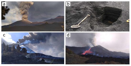 General views of the eruptive column and tephra deposits. (a) Vertical eruptive column (view from the southwest); (b) hole dug in the tephra deposit for a volcano-stratigraphic study; (c) eruptive column leaning towards west on a windy day; (d) eruptive column leaning towards northeast on a windy day.