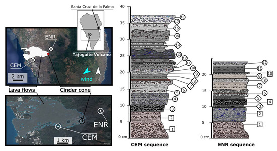 In addition, the studied ashfall sections represent the two main volcano-sedimentary deposit types formed in the island from a granulometric point of view. These physical differences in the volcanoclastic deposits are due to the existence of prevailing northeast winds, which cause preferential ash and lapilli deposition in the southwest side of the island. Only occasionally do southwest winds move the pyroclastic plume to the east. The Enrique and Cementerio sequences are located at a similar distance to the emission cone, but one of them is located southwest (Cementerio), and the other one is located northeast (Enrique).