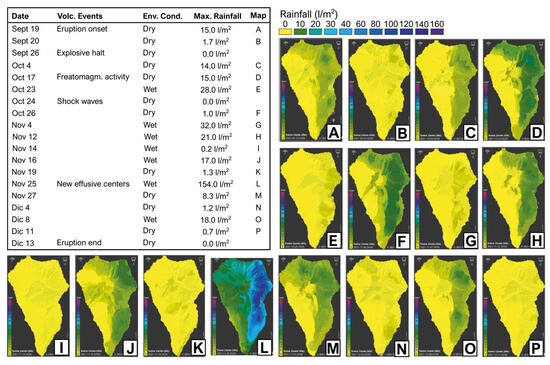 Schedule of the singular volcanic events, environmental conditions, and maximum registered rainfall (“Volc. Events”, “Env. Cond.” and “Max. Rainfall” in the table) during the three months of volcanic eruption in the Tajogaite volcano. The (A–P) maps show the spatial distribution of precipitation during the wet periods (maps obtained from www.HDMeteo.com; accessed on 24 December 2021). (A–P) The corresponding date of each map is included in the table.