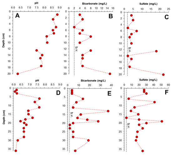 Vertical profiles of pH, bicarbonate, and sulfate concentration obtained for the Enrique (A–C) and Cementerio (D–F) ashfall deposits, as deduced from leaching tests conducted on samples taken at different depths. The background value (b.v.) of bicarbonate and sulfate concentrations (as deduced from blanks conducted on pure MilliQ solutions; Table S1) are given for comparison.