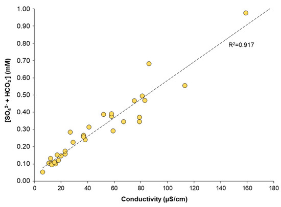 Binary plot showing the strong correlation between the sum of sulfate and bicarbonate ions [SO42− + HCO3−] in mM and conductivity for the whole data set of 30 samples (12 samples from the Enrique sequence and 18 samples from the Cementerio sequence).