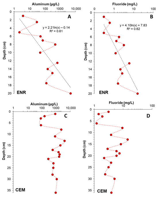 Vertical profiles of water-extractable aluminum and fluoride concentration across the Enrique (ENR, (A,B)) and Cementerio (CEM, (C,D)) ashfall sequences studied in La Palma.