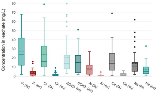 Boxplot diagram comparing the water-extractable content of major ions (F−, Cl−, SO42−, Al, Ca, Na) measured in samples of the first ashfall expelled by the Tajogaite volcano (September–October 2021, taken from [4]; boxes on the left and labelled as “fa”) with the results obtained in this study on ENR and CEM ashfall sequences (boxes on the right and labelled as “ec”). The data points outside the whiskers of the box plots represent outliers.