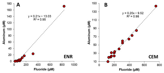 Scatterplots of fluoride vs. aluminum molar concentrations in the obtained leachates from the Enrique (ENR, (A)) and Cementerio (CEM, (B)) ashfall sequences. The regression lines and correlation coefficients (R2) are indicated in both cases.