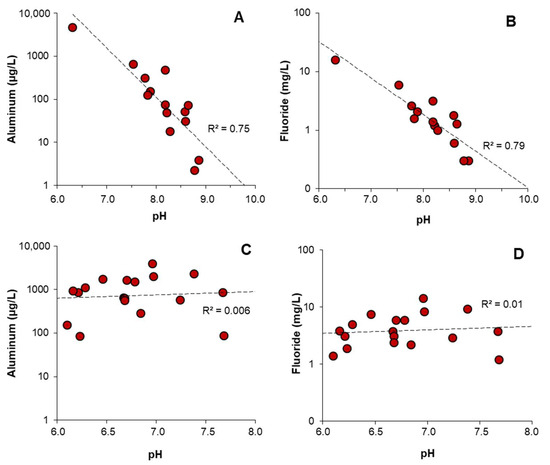 Scatterplots showing the correlation of pH with aluminum and fluoride concentration in the water-extractable fraction of ashfall samples in the Enrique (A,B) and Cementerio (C,D) sequences. The correlation coefficient (R2) is indicated in all cases.