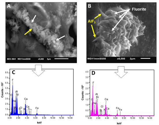 SEM images (A,B) and EDS spectra (C,D) of aggregates formed by finely intergrown crystals of aluminum fluoride (AlF3, yellow arrows) and fluorite (CaF2, white arrows) found in the studied ashfall particles from La Palma.