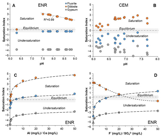 The results of the geochemical modeling calculations are shown in Figure 12, which shows the variation in the saturation index for selected minerals (fluorite, gibbsite, gypsum) with respect to pH (Figure 12A,B) and also with respect to the concentration of major cations (Al, Ca; Figure 12C) and major anions (F−, SO42−; Figure 12D). The saturation index is defined as SI = log [IAP/Ksp], where IAP is the ion activity product, and Ksp is the known solubility product constant of a given mineral phase. The SI values provide useful information about the saturation state of the aqueous solutions (the leachates) with respect to given mineral phases. In this case, we selected mineral phases that have been widely observed in the ashfall samples of La Palma (e.g., fluorite, gypsum [4]) and others that are well-known solubility controls of Al transport in acidic waters (e.g., gibbsite [31,32,33,34,35,36,37,38]). The SI values plotted on Figure 12A,B were calculated on the basis of the element concentrations obtained from the leachate compositions (Tables S1 and S2). An exception had to be made for calcium, since this element was below detection (<1 mg/L) in most samples. In this case, we assigned an arbitrary concentration of 0.5 mg/L, which could at least allow for a rough estimation of the saturation state of Ca-containing minerals (i.e., fluorite and gypsum). Even if these SI values for fluorite and gypsum could have been slightly overestimated, they were still valid for comparison with the Al-containing phase gibbsite. Thus, the plots of Figure 12A,B show that the leachates were always strongly undersaturated with respect to gypsum (SIgypsum = −3 to −5) at the low Ca concentrations considered. Fluorite, however, showed near-equilibrium conditions (SIfluorite = −0.4 to −0.6, Figure 12A) for most samples in the ENR sequence and in some samples of the CEM sequence (Figure 12B). These results suggest that fluorite could have acted as an upper solubility limit for both F and Ca in the pH range of 7.0–9.0. This is in good agreement with our previous study [4] and with the known control of fluorine concentrations in natural waters, which is usually controlled by fluorite solubility [14].