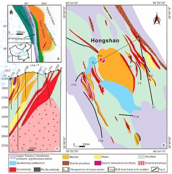 The study area’s geology: (a) tectonic setting of Yidun Terrane and Hongshan deposit (after Li et al. [50]); (b) geological map of Hongshan Cu–Mo deposit (after Peng et al. [48]); (c) geological cross-section of Hongshan deposit, showing the spatial relationship of orebodies, strata, and intrusions (after Peng et al. [48]).