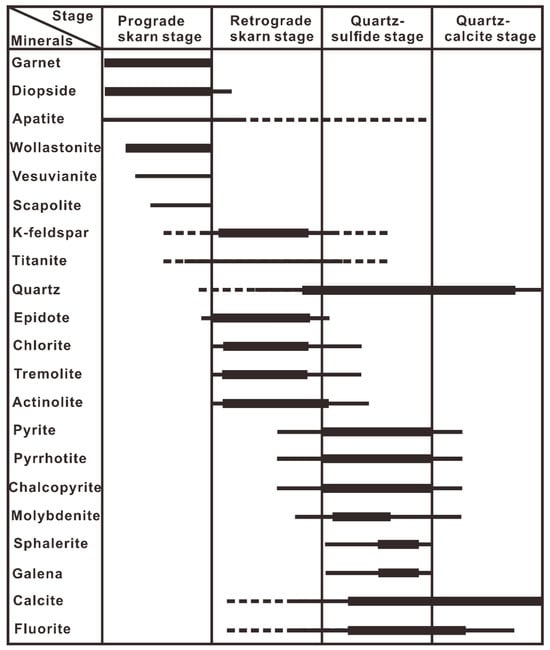 Paragenetic sequence diagram for alteration assemblages in the Hongshan skarn. The widths of lines indicate relative abundance levels of minerals. Narrow lines show minor minerals. Dotted lines indicate traces or uncertainties at the stage.
