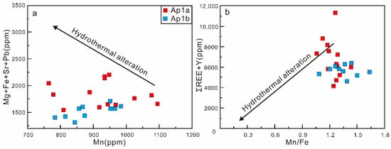 The granite porphyry in our samples was weakly affected by potassic and phyllic alterations. The elements of primary igneous apatite, such as REE, Y, and Mn, are commonly extracted by the magmatic–hydrothermal fluids that relate to potassic and phyllic alterations [34]. Specifically, the substitution of Mn in apatite by Mg + Fe + Sr + Pb from the fluids occurs during alterations in porphyry deposits, leading to a negative correlation between Mn and Mg + Fe + Sr + Pb [20]. Thus, the trend changes in these graphs can indicate whether a hydrothermal alteration has occurred to the apatite (Figure 6a,b) [20,34]. The plotting results show that there are no discernible hydrothermal alterations in Ap1a and Ap1b apatites. This likely reflects that the apatite shows strong resistance to weathering and alterations [28,29], which may have preserved the original information of the melt. As a result, we consider that the abundance of elements in Ap1a and Ap1b can be used to identify the magmatic compositions.